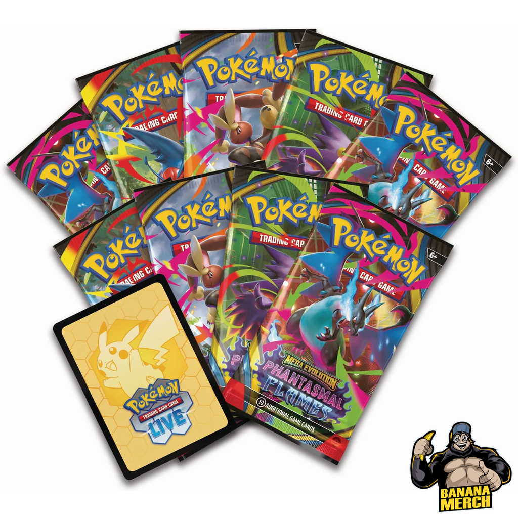 - Contains 9 booster packs from Pokémon TCG: Mega Evolution—Phantasmal Flames and 1 full-art foil promo card featuring Charcadet. (Each booster pack contains 10 game cards, 1 Basic Energy, and 1 Pokémon TCG Live code card. Cards vary by pack.)