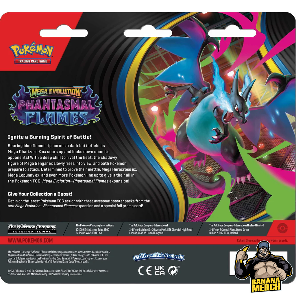 Searing blue flames rip across a dark battlefield as Mega Charizard X ex soars up and looks down upon its opponents! With a deep chill to rival the heat, the shadowy figure of Mega Gengar ex slowly rises into view, and both Pokémon prepare to attack. Determined to prove their mettle, Mega Heracross ex, Mega Lopunny ex, and even more Pokémon line up to give it their all in the Pokémon TCG: Mega Evolution—Phantasmal Flames expansion!